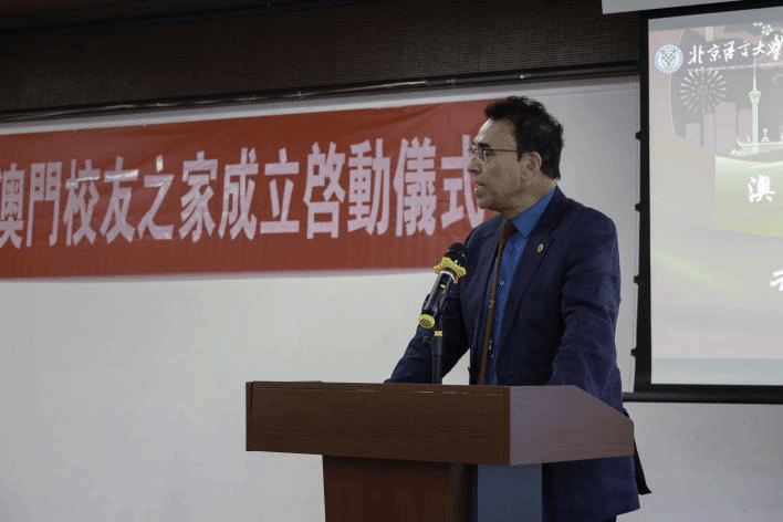 澳门校友之家名誉顾问高天赐致辞,他回忆起自己在澳门回归之前被澳门特区政府派到北语学习的经历。刚到北京时他一句话都不会讲,一个字都不会看,点菜乱点一气,和同学们吃饭,点了十个菜全都是辣的。他的诙谐幽默的讲述引起台下校友一片笑声。今天,他站在这里,非常自信地全程用普通话致辞。而且得益于在北语的学习,使他在澳门回归后继续服务于澳门的社会发展,并于今年9月举行的澳门特别行政区第八届立法会选举中,以最高票再次当选直选议席议员。他表示,北语澳门校友之家成立非常重要,这是澳门校友的“家”。希望校友之家今后可以联系更多的澳门校友,宣传语言、普通话的重要性,大力推动语言和文化的交流。