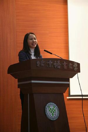 徐雨隽老师作为教师代表做了精彩的发言。她利用课下时间调查了一些学生关于老师以及课程的疑问和看法,利用演讲时间一一作答。徐老师风趣幽默的作答掀起了全场的一个小高潮。
