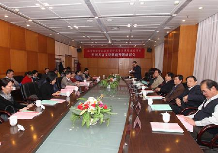 会议由科研处张维佳处长主持。崔希亮校长在致辞中指出,方言文化是非物质文化遗产的重要组成部分,本项目研究意义重大,它的申报成功,显示出我校人文社会科学研究在组织跨学科综合性研究团队、承担高级别重大课题方面的竞争力,学校将对项目的研究工作予以全力支持。何健处长介绍了教育部重大课题攻关项目的有关情况和开题要求,对课题组所做的前期工作予以了充分肯定。接着,首席专家曹志耘教授向专家组汇报了本项目的总体设计和研究计划,展示了《中国方言文化典藏调查手册》和方言文化音像样品;专家们就本项目的研究意义、研究方法、重点难点、研究成果开发展示等问题进行了认真的评议,与课题组展开了热烈的讨论。专家组认为,系统科学地调查记录我国方言文化的传统面貌,及时抢救保存和传承方言文化遗产,已成为我国政府和学术界一项迫在眉睫的历史使命,也是社会大众高度关注的事情,“中国方言文化典藏”项目的研究具有前瞻性、全局性和科学性,课题组研究实力雄厚、经验丰富,工作规范科学实用、操作性强,调查点、调查团队设计合理,研究进度安排得当,可望取得精品成果。李宇明司长进一步指出,本项目应具备更宏观的研究视野,要站在学科前沿,要有示范性,研究成果要及时让各方共享,要争取社会大众积极参与,使方言文化的调查研究工作与社会接轨。最后,何健处长对开题研讨会进行了总结,并鼓励课题组以优秀的研究成果结项。曹志耘教授代表课题组向与会领导、专家表示感谢,并表示将认真吸取领导、专家们的建议,确保按时、按质、按量完成项目的研究工作,力争创造标志性重大成果。“中国方言文化典藏”项目将按照统一规划,采用科学方法和现代化技术手段,实地调查收集实态的中国方言文化资料,经整理、加工,建设中国方言文化典藏多媒体资料库,编写出版中国方言文化典藏系列图册,为保存和传承中国传统方言文化而努力。预期成果包括《中国方言文化典藏调查手册》、《中国方言文化典藏图册》(分地系列)及中国方言文化典藏多媒体资料库。