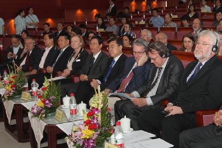 国际高校翻译学院联合会主席Hannelore LEE-JAHNKE女士,国际会议译员协会主席Beno?t KREMER先生,国际高校翻译联盟秘书长Frans De Laet先生,中国译协秘书长、国际翻译联盟副主席黄友义先生,英国大使馆文化教育处教育一秘兼中国区英语教育总监Dr.Grahame Bilbow,广东外语外贸大学校长、中外翻译学院院长代表仲伟合先生,外交部新闻司副司长、新闻发言人、北语校友代表洪磊先生等出席会议并致辞。他们对北语高级翻译学院的成立致以最衷心的祝贺,并期望该院不断培养出更多优秀的翻译人才。