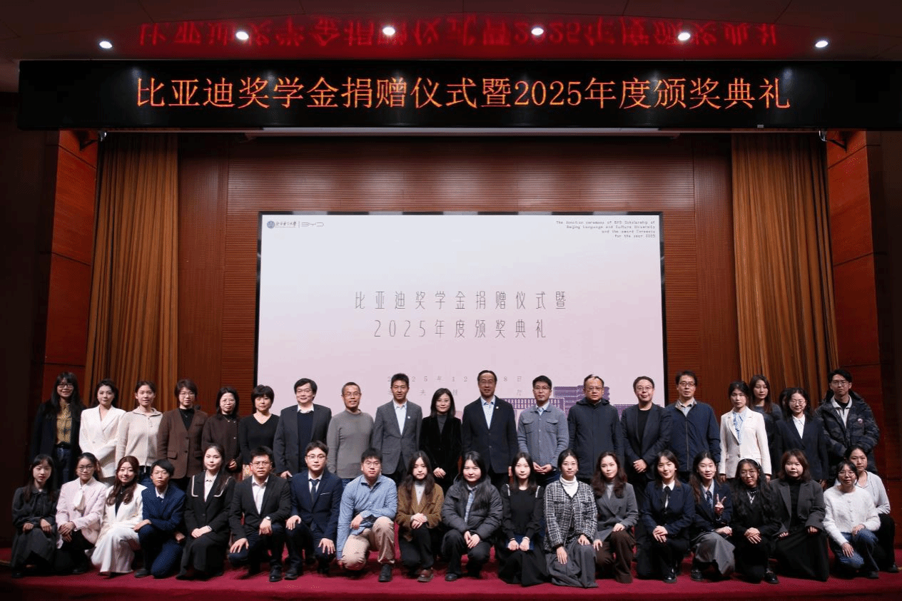 北语新闻网12月22日电(通讯员 张鑫 摄影 杨煊泽)12月18日,北京语言大学比亚迪奖学金捐赠仪式暨2025年度颁奖典礼在逸夫报告厅隆重举行。党委常委、副校长黄益方,校长助理、研究生院院长郭鹏出席活动。学工部、研工部、教育基金会秘书处、就业创业指导中心、外国语言文化学院、英语和高级翻译学院等相关负责人出席活动。比亚迪股份有限公司区域人力资源总监王文星等莅临活动现场。来自外国语言文化学院、英语和高级翻译学院的教师与学生代表共同见证。