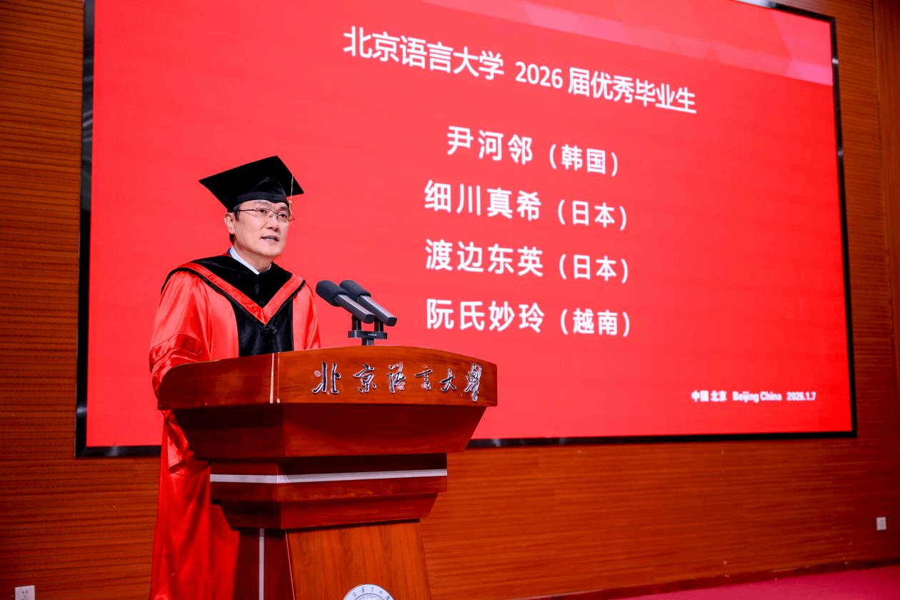 副校长张宝钧教授主持仪式并宣读《北京语言大学关于表彰2026届优秀毕业生的决定》。来自国际中文学院的尹河邻(韩国)、细川真希(日本)、渡边东英(日本)以及东京学院阮氏妙玲(越南)4名本科生荣获“北京语言大学优秀毕业生”称号。