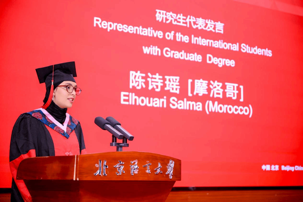 来自摩洛哥的研究生代表陈诗瑶同学则分享了自己追逐北语梦的坚持与收获,她引用 “学而时习之,不亦说乎”表达其博士阶段的学习让自己更加坚定深耕专业、促进文明互鉴的信念。并特别感谢了博士生导师的悉心指导和母亲的默默支持。