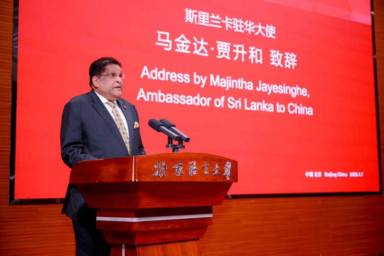 马金达・贾升和大使作为嘉宾代表致辞。他深情回顾了中斯两国上千年的传统友谊,强调建交近70年来两国在各领域的友好合作成果,并高度赞誉北京语言大学在推动国际合作、搭建跨文化桥梁方面的重要作用。作为北语校友,贾升和大使分享了自己在校的求学经历,感谢北语对其个人成长的深远影响。他提议北京语言大学在斯里兰卡建立“中国语言文化推广中心”,打造“斯里兰卡-中国社区”,让更多斯里兰卡民众受益于以北京语言大学为代表的中国优质教育资源。他期许全体毕业生成为中国与各自祖国之间的友谊使者,延续跨文化交流的使命。