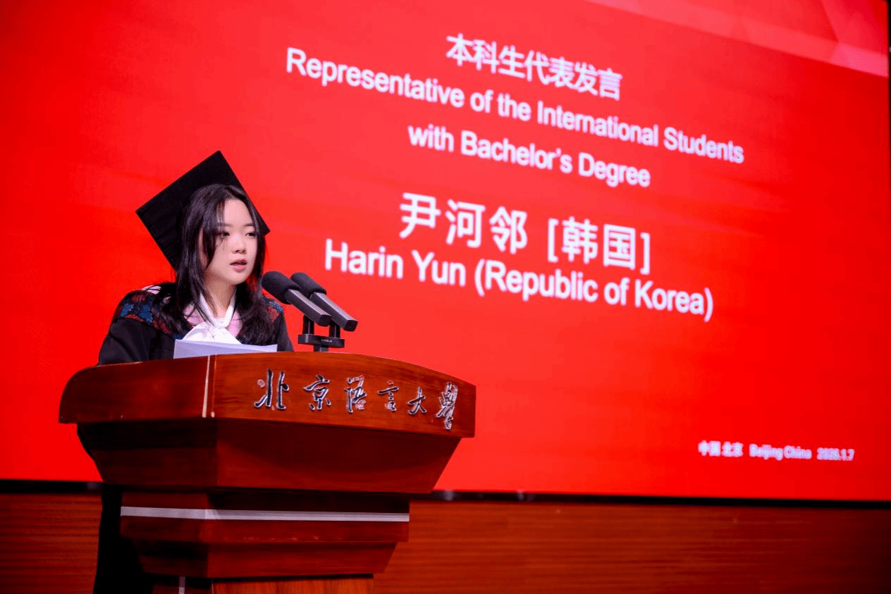 毕业生代表们分享了在北语的成长感悟。来自韩国的尹河邻同学作为本科生代表在毕业典礼发言。她回忆初到北语时中文薄弱、内心忐忑,在老师耐心教导与鼓励、各国同学互助陪伴下,不仅熟练掌握汉语,更深入感受中华文化、拓宽国际视野。她感恩师长践行 “诲人不倦”,感谢同窗温暖相伴,感慨毕业是新起点,将带着北语赋予的知识与勇气奔赴未来,祝愿母校、师长与同窗皆好。
