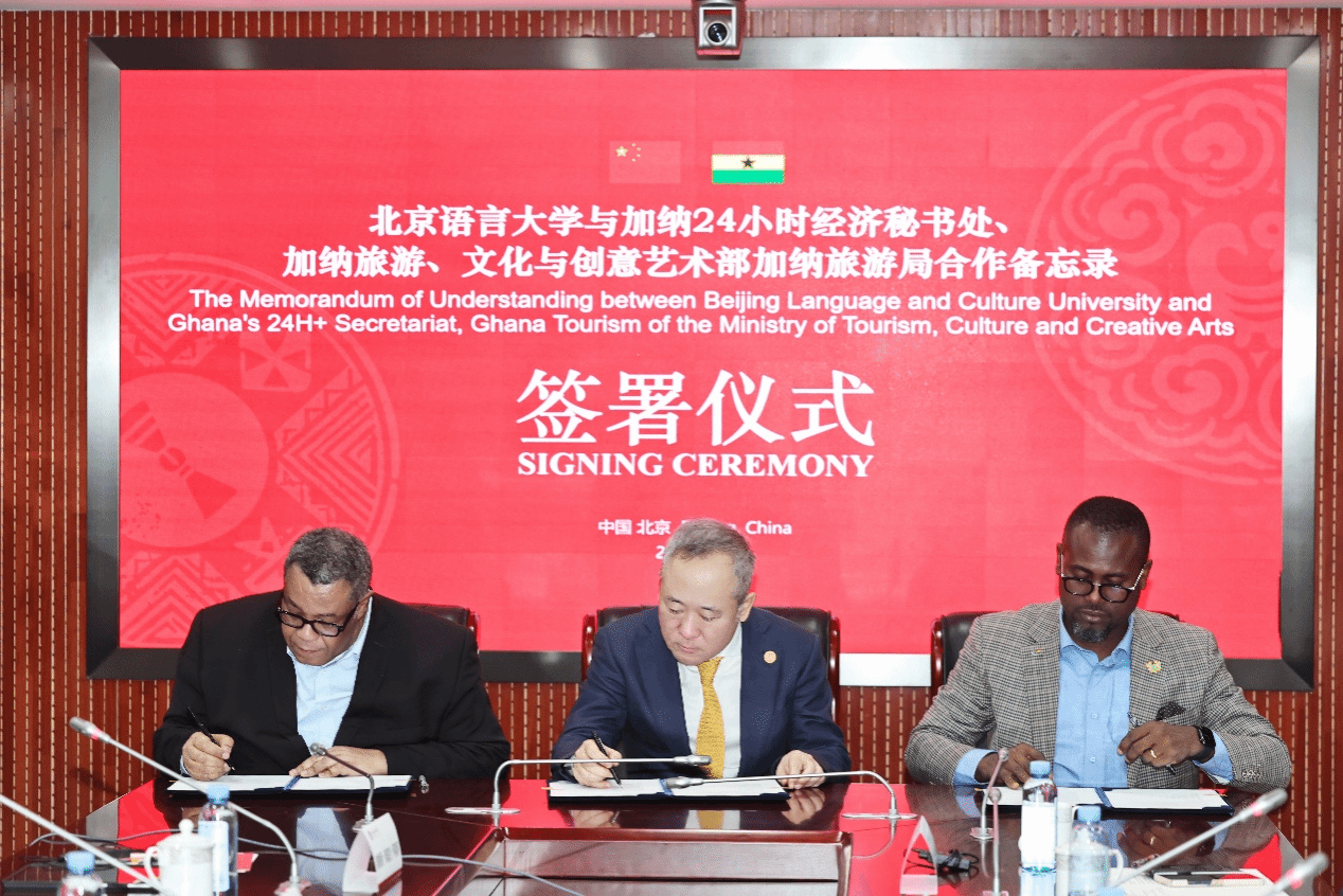 随后,段鹏校长与加纳总统顾问塔诺阁下、加纳旅游局副总裁阿格雷共同签署《北京语言大学与加纳24小时经济秘书处、加纳旅游、文化与创意艺术部加纳旅游局合作备忘录》。