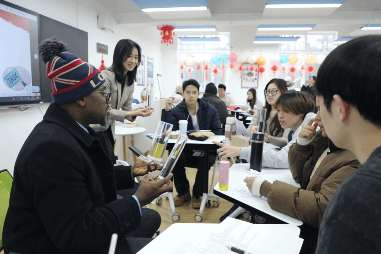 访问期间,代表团走进应用中文学院智慧教室参加课堂观摩,并与中外学子展开深入互动交流。在“中文+职业技能”综合实践任务“加纳电缆市场调研与决策模拟”课程中,代表团成员认真听取学生围绕市场分析、方案设计和决策逻辑的汇报,并结合加纳产业实际进行现场点评与指导。通过亲身参与课堂讨论与情景模拟,代表团对北语将语言学习与真实产业情境相结合的人才培养模式给予高度评价。