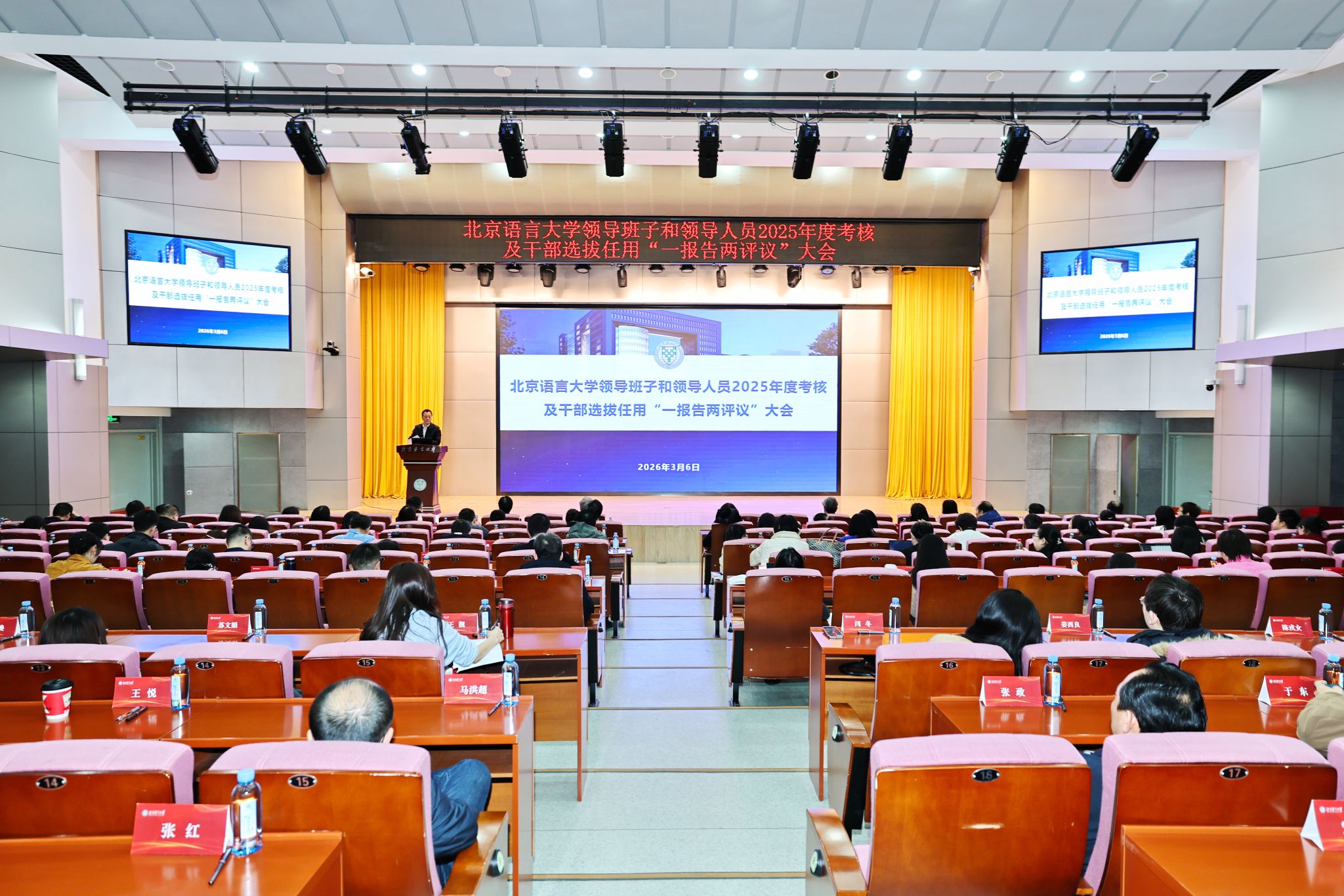 北语新闻网3月9日电(通讯员 刘佳俊 摄影 魏达)3月6日下午,北京语言大学2025年度领导班子和领导人员考核及干部选拔任用“一报告两评议”大会在弘成报告厅举行。校领导、校党委委员和纪委委员、全体中层干部、各级“两代表一委员”、校学术委员会主任和副主任、教代会执委会主任和副主任、基层党员干部教师代表、民主党派负责人和无党派人士代表、离退休人员代表等近200人参加会议。倪海东书记主持会议。
