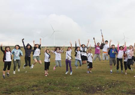 漫长的等待后,风景秀美的辉腾格勒大草原张开热情的臂膀欢迎三地青年的到来,如茵的绿草、五色的野花、成群的牛羊、骑马的壮汉、如巨人般矗立的发电风车……车内原本有些疲倦的营员们看着雨后傍晚的草原顿时有了精神,纷纷拿出相机兴奋地拍下一张张照片。