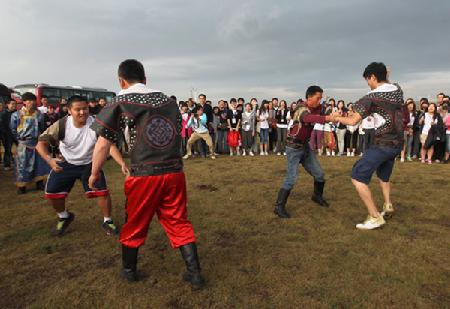 最有意思的是京港澳营员还穿上了摔跤服,与当地的蒙古族小伙子切磋了起来,体验了一把蒙古式摔跤的魅力,双方投入的表演引得掌声、喊声、加油声响成一片,兴奋挂在每一个营员的脸上。