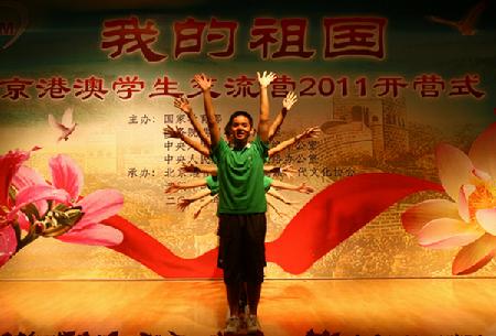 当晚,来自北语的全体四十名营员用热情的开场歌舞《相亲相爱》表达了内地青年对从千里之外赴京的港澳学子们的热烈欢迎,会场的气氛瞬间被点燃。接着,来自北京、香港、澳门、内蒙古四地高校和高中的年轻营员们在舞台上将爆满的激情挥洒,优美的歌声衬托着一张张灿烂的笑脸,欢快的舞步表现出一份份激越的心情。话剧、健美操、歌舞……各式各样的节目让在场所有人目不暇接,台上的营员卖力地表演,台下的营员不断地鼓掌、呼喊,气氛十分热烈。