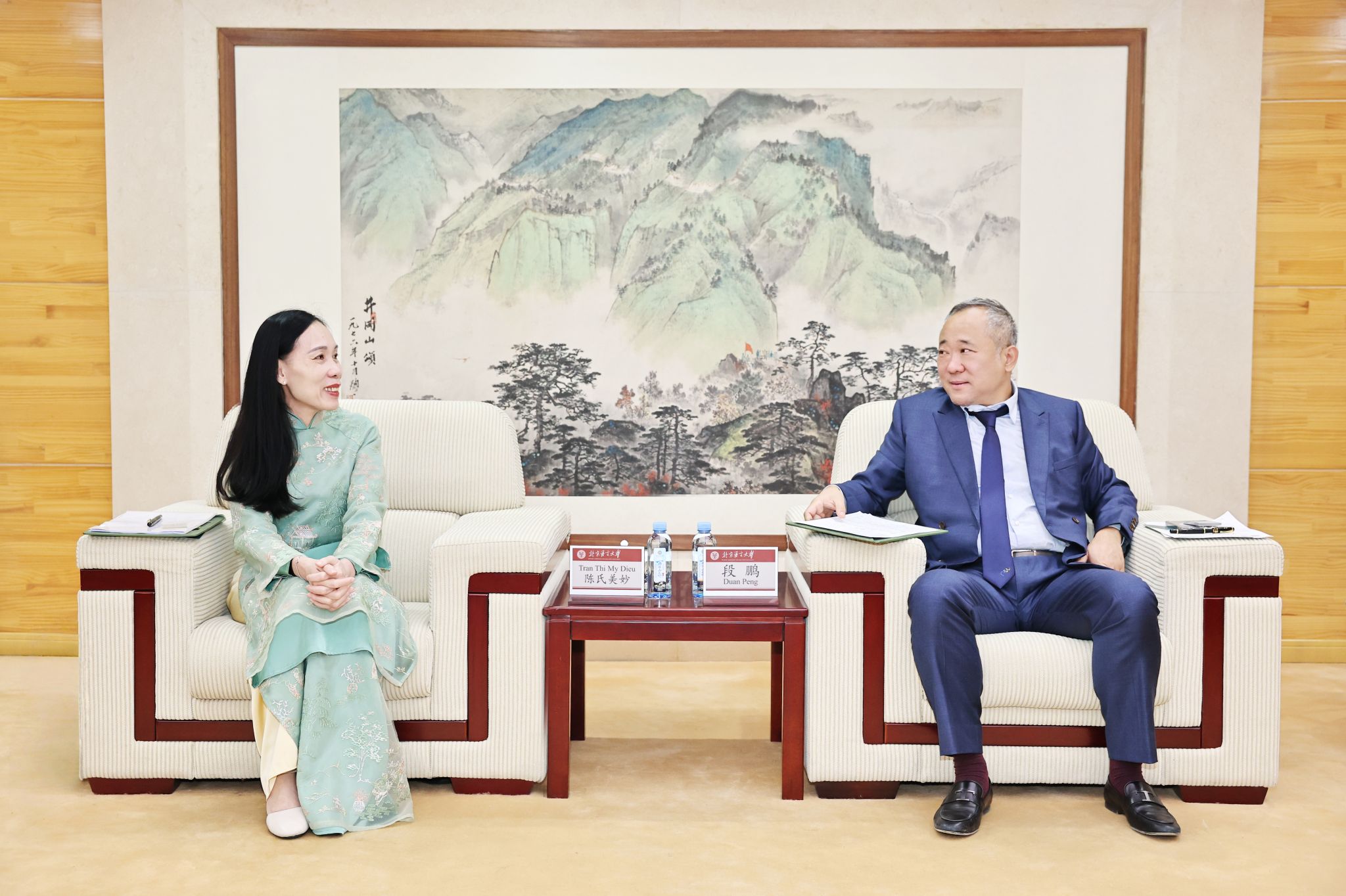 陈氏美妙校长对北语的热情接待表示诚挚感谢,高度评价北京语言大学在国际中文教育推广、中越人文交流方面发挥的引领作用和重要贡献。她积极回应段鹏校长的合作提议,表示完全赞同两校的合作思路与具体举措,文朗大学热切期待与北语在师生互访、联合科研、人才联合培养等方面进一步深化务实合作,助力中越两国教育文化交流再上新台阶。