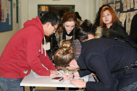 在教一楼接待站,由于长期生的报到注册由两个学院负责,为更协调地办理相关注册手续,留学生处设立总服务台,负责查验留学生护照和录取通知书,发放留学生手册和入学指南及入学登记表;汉语学院、汉语进修学院分别设立分服务台,具体负责本院新生的报到和老生注册工作。