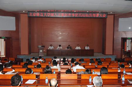 6月4日下午,北京语言大学深入开展创先争优活动动员部署大会在逸夫楼报告厅隆重召开。党委书记王路江作了题为《以发展创先进,以奉献争优秀》的动员报告。学校党委委员、纪委委员,全体党员处级干部,教工及学生党支部书记参加了大会。此次大会的召开标志着学校创先争优活动正式启动。