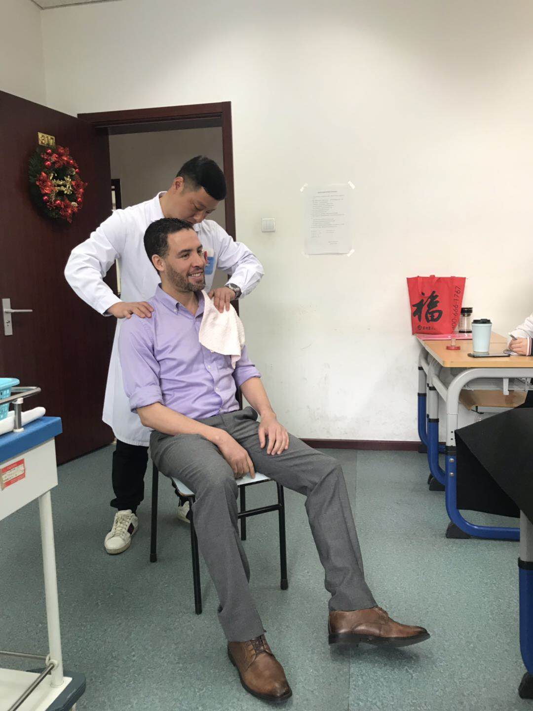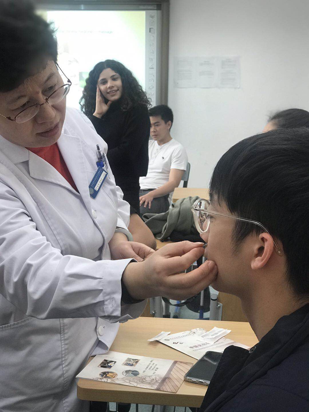 在中医体验教室,同学们更是怀着极大的兴趣和好奇心,不仅了解了中医知识,而且亲身体验了走罐、针灸、推拿、刮痧等疗法。大家连连赞叹中医的奇妙和中国古人的智慧。在中医香囊体验结束后,几位同学兴奋地向朋友展示着自己亲手制作的药囊。中医体验项目已是第三次在“中国文化体验日”推出。该项目由我院与校中医体验基地及校医院合作,力求真实、生动地向留学生展示用中国智慧解决健康养生难题的中医方案。项目自推出以来,一直大受学生好评。