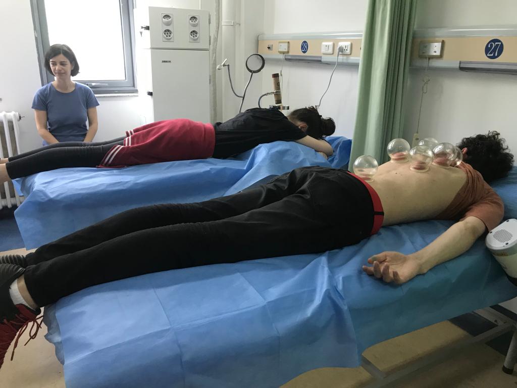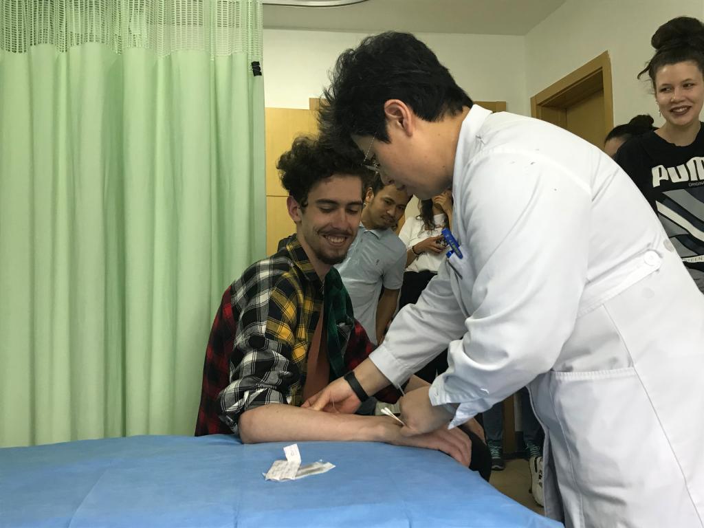 在中医体验环节,医生首先向大家介绍了四诊:望、闻、问、切,然后大家观摩了医生如何用针灸治疗病症,并亲身体验了针灸理疗,随后依次轮流体验了推拿和拔罐等中医传统疗法。同学们在这一环节了解和体验了中医的治疗手段,在体验过程中连连赞叹称奇,大家都被中国古人的智慧和中医的奇妙深深折服。