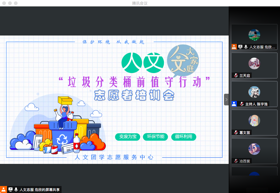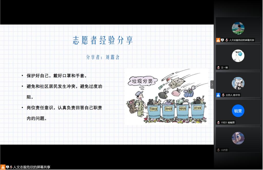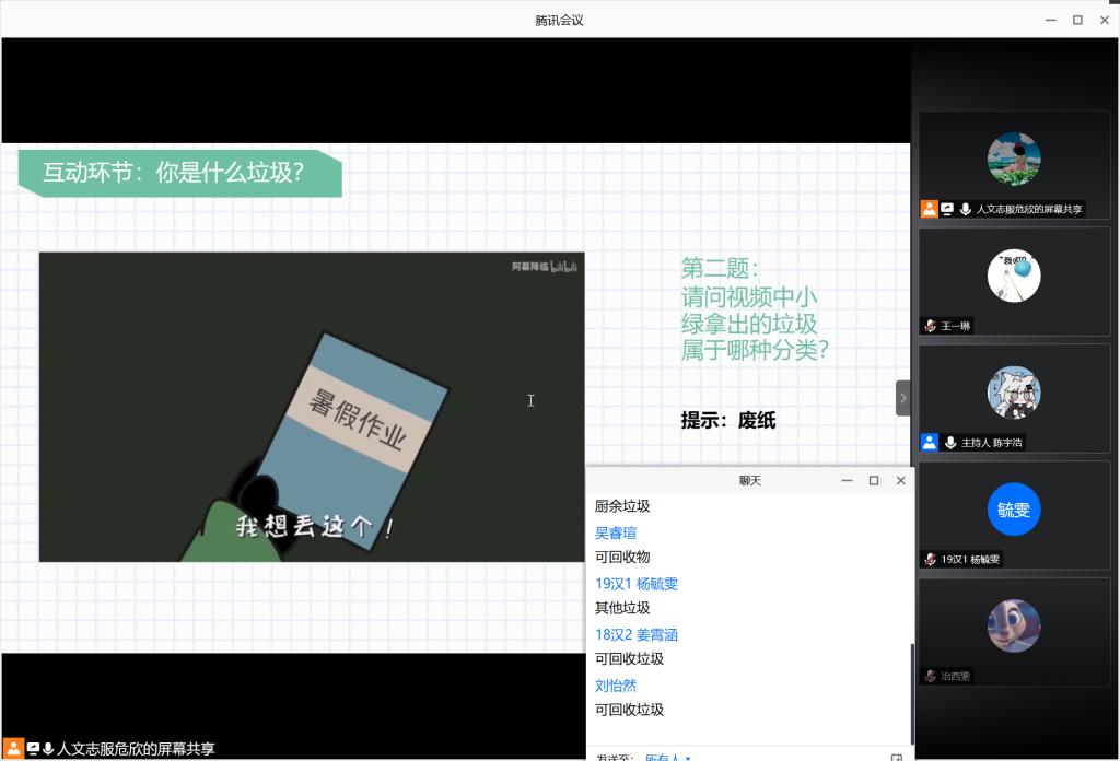 志愿服务中心副主任陈宇浩从定义、目的、成就、作用四个方面向志愿者们介绍了垃圾分类的基本知识,并邀请北京市益行志愿服务队垃圾分类培训师毕颖老师对垃圾处理的专业知识和北京市垃圾分类相关规定做了详细介绍。随后,18级汉语国际教育2班的刘露含同学从自我防护、服务礼仪、责任意识等方面分享了自己的志愿经验,她的亲身经历让即将上岗的志愿者们对活动充满期待。紧接着,志愿服务中心主任危欣通过介绍“桶前值守”专项行动的服务内容和注意事项,使志愿者们对项目的工作要求与安排有了更清晰的认识。此外,志愿服务中心精心策划了垃圾分类互动环节,与志愿者们在聊天区进行交流,分辨垃圾种类,使志愿者们对北京市垃圾分类的基本规定有了更清晰的认知。
