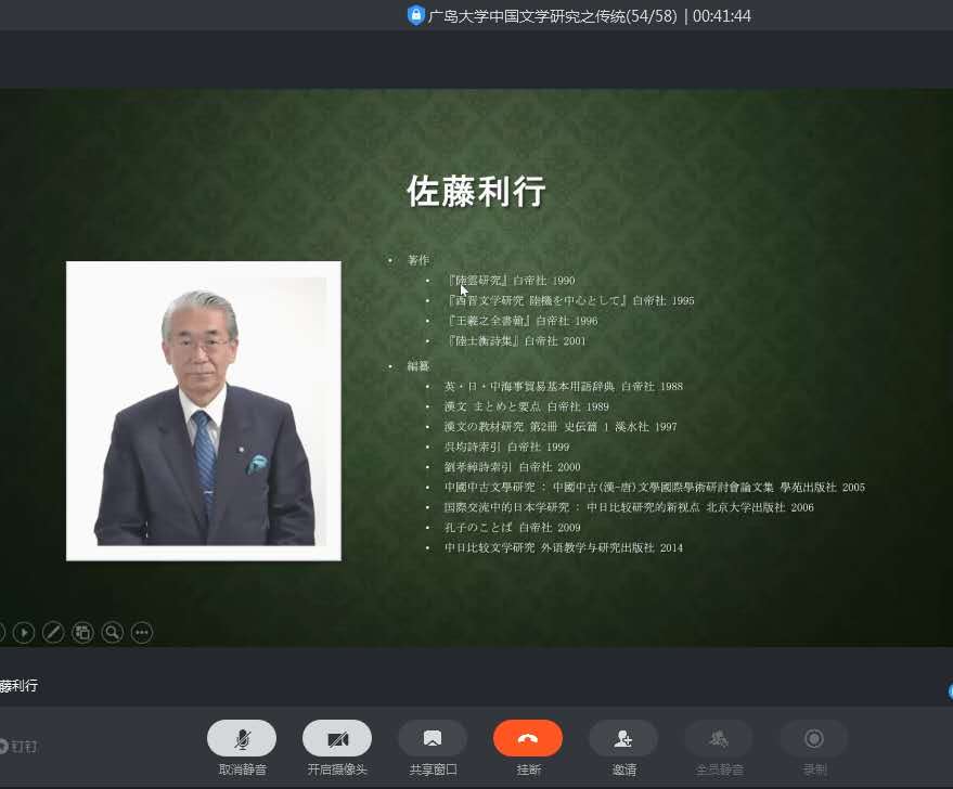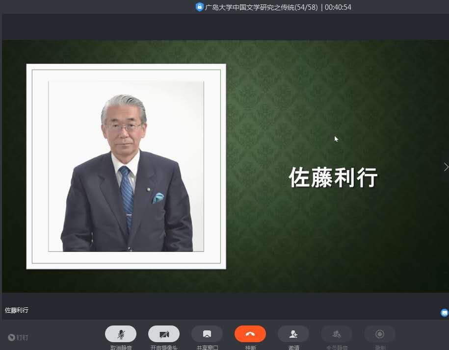 佐藤利行教授,现任日本广岛大学理事兼副校长、文学研究科教授。是外交院、中国人民大学外国语学院、南京大学文学院等多个知名院校的客座教授。研究方向为古典文学、六朝文学、中日比较文学。曾获“北京市人民政府教育委员会国际交流贡献赏”和“中国政府友谊奖”,为中华文化研究及对外传播做出了巨大贡献。