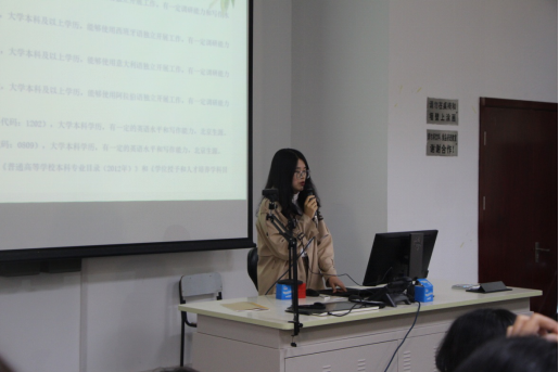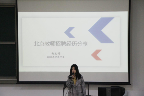 交流会包括两大部分,经验分享及问答环节。首先作经验分享的是赵志娟学姐,现就职于首师大附属密云中学。赵学姐求职经验丰富、演讲方式风趣幽默,为大家带来了满满干货。学姐建议大家在面试时把未来规划的时间设置得长一些,给HR稳定感。