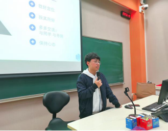 最后上场进行分享的是来自17计算机2班的周逸杰学长,他保研至北京科技大学计算机科学与技术专业。他首先简要分析了保研中学生和导师之间存在的双向选择关系,并结合自身对保研的思考为同学们提供了参考。接着,他具体介绍了如何获取保研资格以及需要注意的几个要点,如找好定位、投其所好、多多交流和保持心态等。