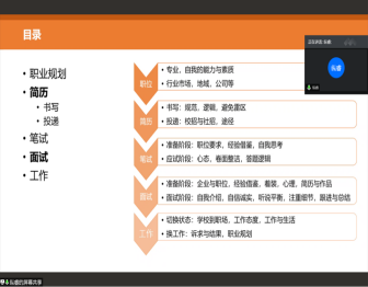 15届数字媒体技术专业的纵睿学姐进行分享,她目前担任点点互动游戏策划兼项目管理。她的分享主要围绕着应聘时笔试和面试的要点展开。纵睿学姐表明,职业规划对于就业的选择来说是很重要的一点;她详细地说明了简历该如何填写与投递并强调好的简历是应聘成功的前提;她从准备阶段与应试阶段两方面介绍了笔试与面试的重点;纵睿学姐分享了从工作中获得的一些小心得,让同学们更了解以后工作中各方面的流程,并祝愿同学们能找到心仪的工作。