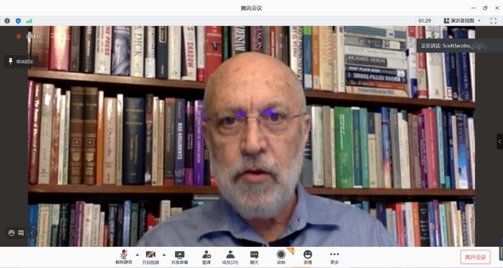 Scott Jacobs教授结合实例深入浅出地向大家介绍了规范语用学理论,鼓励大家要辩证、全面地看待问题。在每场线上讲座中,听众都对讲座内容进行积极的反馈与提问,并与教授展开讨论,大家在此次系列讲座中收获颇丰,受益匪浅。Scott Jacobs教授的系列讲座得到了师生们的热烈欢迎,取得了圆满成功。
