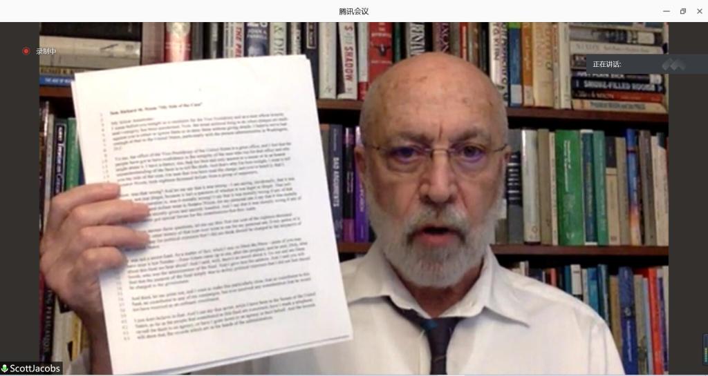 在第一讲中,Scott Jacobs教授向大家系统介绍了论证规范语用学的特点和研究方法。在第二讲到第六讲中,Scott Jacobs教授利用规范语用学理论对1952年尼克松的“Checkers speech”进行了全面系统的分析。在第二讲中,Scott Jacobs教授解释了选取这一演讲进行分析的原因,并介绍了Herbert Simons (1970)提出来的RPS方法。第三讲中,Scott Jacobs教授利用RPS方法详细分析了尼克松1952年的 “Checkers speech”要达到的目标、要求和面临的困境。教授在第四讲中谈及了尼克松演讲中所使用的策略设计和论证结构,特别介绍了贯穿其中的情感逻辑。第五讲中,教授讲述了尼克松在演讲中扮演了一个 “普通人”的角色,并由此成功说服美国大众相信其人品:诚实可信、品德高尚、充满善意。教授在第六讲中介绍了他本人提出的两条修辞宽容准则,并对传统论证研究中对尼克松演讲的批判意见进行了反驳。