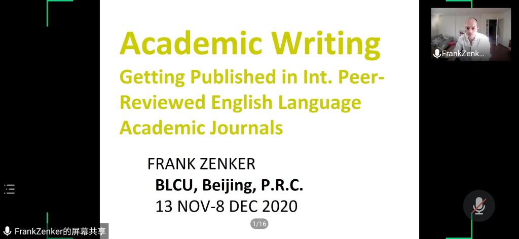 2020年11月13日至12月07日期间,瑞典隆德大学Frank Zenker教授通过线上的方式为师生们做了题为“学术论文写作”的十讲系列讲座。本次系列讲座外国语学部英语学院主办。