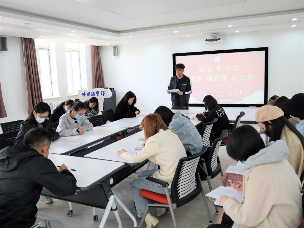 竞赛开始之前,支部书记郭龙向参赛者传达了外国语学部党委开展党史学习主题教育的精神以及《外国语学部党史学习教育重点任务清单》,号召支部党员、积极分子积极认真学习党史。之后,组织委员马小菁介绍竞赛规则和答题要求,宣传委员陈鑫分发竞赛试题和答题卡。