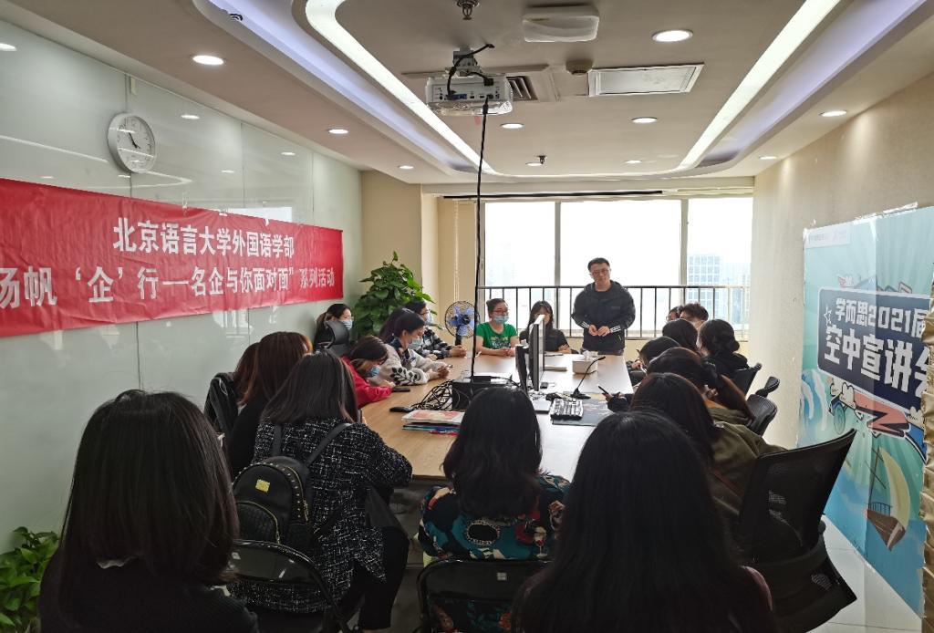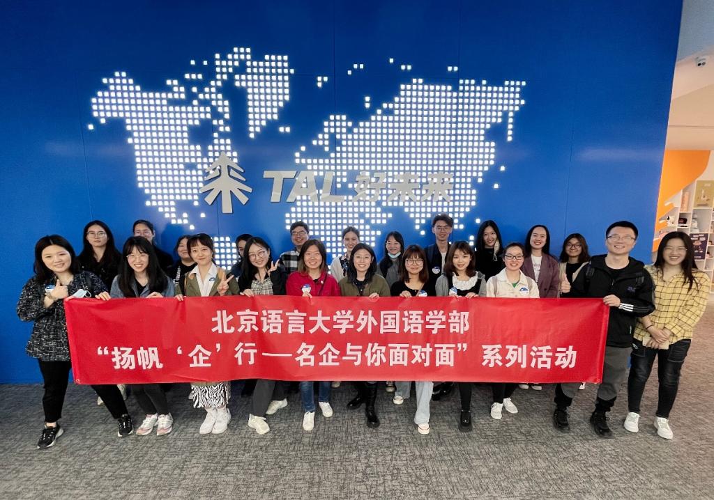 4月29日,为丰富同学们的校园生活、向准毕业生宣传优秀名企文化,北京语言大学外国语学部成功举办“扬帆企行-名企与你面对面”活动。由张艳老师带队的师生一行近三十人前往好未来教育集团参观交流,双方就开展校企友好合作进行了深入探讨。