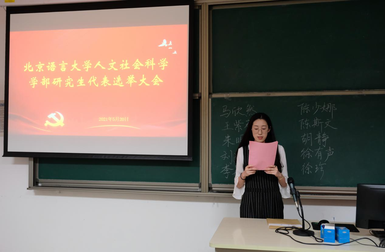 5月20日晚,北京语言大学人文社会科学学部研究生代表选举大会于教四104召开。人文社会科学学部团委书记玄铮、研究生辅导员万阳卓出席会议,人文社会科学学部22名研代表参加会议。会议由人文社会科学学部研究生会主席路景怡主持。