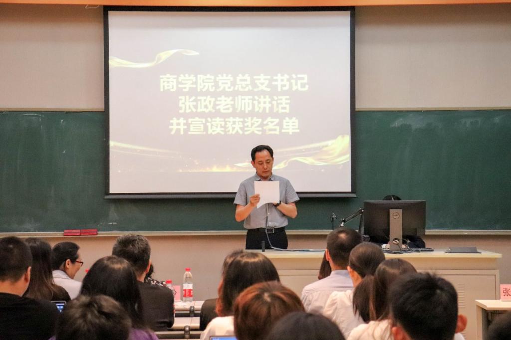 典礼伊始,商学院党总支书记张政老师讲话。张政老师指出,本次学术论坛意义重大,其根本目的是鼓励学生多写论文、写好论文,提高学生的学术水平与能力。随后,张政老师对支持举办此次论坛的师生表达诚挚谢意,宣读获奖名单,并对获奖师生表示祝贺。