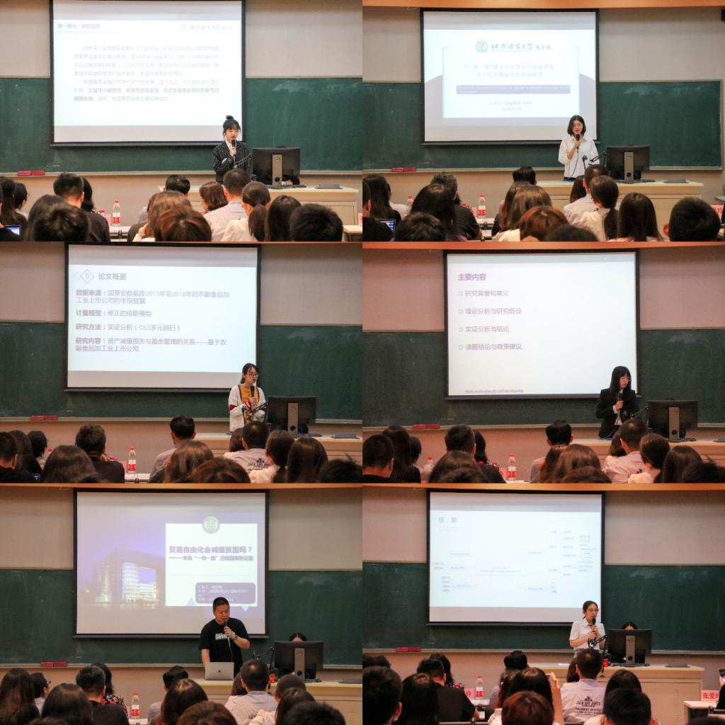 获奖学生代表刘可欣、卢俐廷、谢蕙名、王怡媛、韩良秋、蒋华月就北京市普惠金融水平评价研究、“一带一路”背景下中国对外直接投资对人民币国际化的影响研究、资产减值损失对盈余管理影响的实证研究——以我国农副食品加工业为例、我国企业金融化对实业投资的影响效应研究、贸易自由化会减缓贫困吗?——来自“一带一路”沿线国家的证据、O2O商业模式下消费者对餐饮业外卖的选择偏好分析依次进行了论文汇报展示,石峰老师、金莲花教授、王旭老师、段琪斐老师、巩少伟教授分别做出点评。