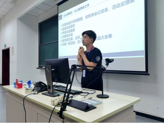 接下来由副主席许浒代表学生会主席团发言。他总结了过去一个学期以来学生会举办各项活动过程中的收获,感谢了所有支持学生会工作的老师和同学。他祝愿二十一届学生会的全体成员,无论是选择留下还是离开,都能带着眼里的光继续在自己的领域内发光发热。