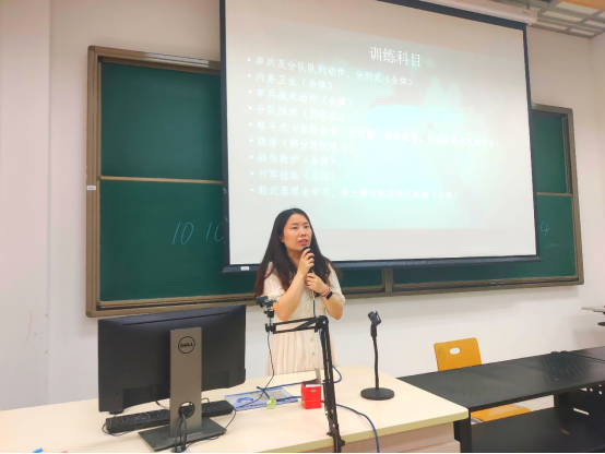 王晶老师对军训前后的一些注意事项进行了说明,强调一切行动听指挥,以整体大局为重。她指出了同学们在军训中可能遇到的一些问题并给出了自己的解决方案,提醒同学们做足准备,严肃认真对待这次锻炼的机会。