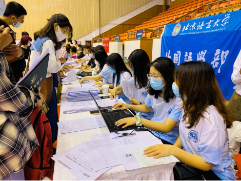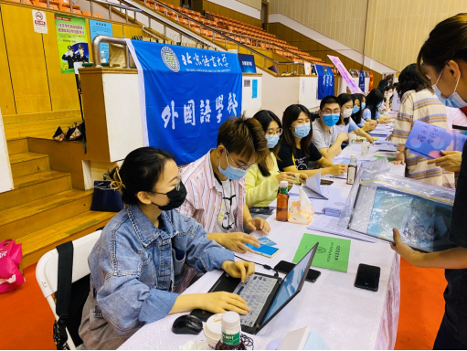 当天,外国语学部学生工作办公室辅导员带领团学联干部有条不紊地迎接新生到来。不到9点,新同学们就提前自觉排起了长队。从最开始的学位证书核验到最后的领取材料、签字确认,同学们经历的不仅是一项项流水般的报到流程,更意味着每一位同学都正式成为了一名“小联合国”的外语人。
