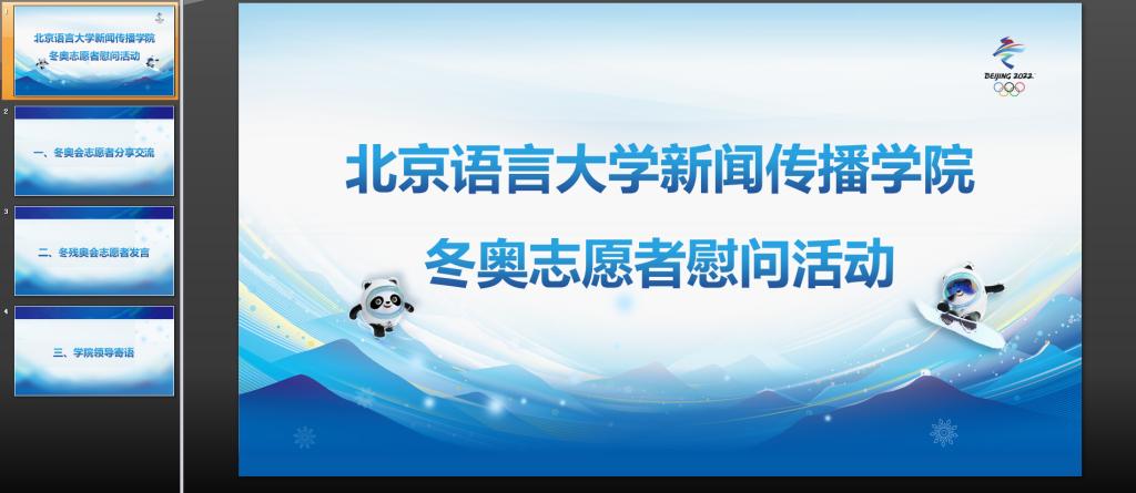 新闻传播学院的志愿者们在本次服务北京冬奥会的工作中充分展现了“有理想、有本领、有担当”的新时代中国青年形象,在国际赛场上诠释了奉献、友爱、互助、进步的志愿服务精神。同学们要在这次活动中总结经验教训,发挥模范带头作用,将不畏苦难、积极向上的理想信念传递给身边的同学。