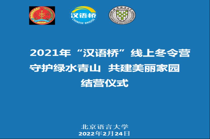2月24日,由教育部中外语言交流合作中心主办,北京语言大学承办的汉语桥“守护绿水青山 共建美丽家园”线上冬令营顺利结营。北京语言大学国际教育管理处副处长黄潇潇、柬埔寨金边皇家大学DHY汉语中心主任黄丽云、任课教师代表和50余名学员在线参加结业仪式。