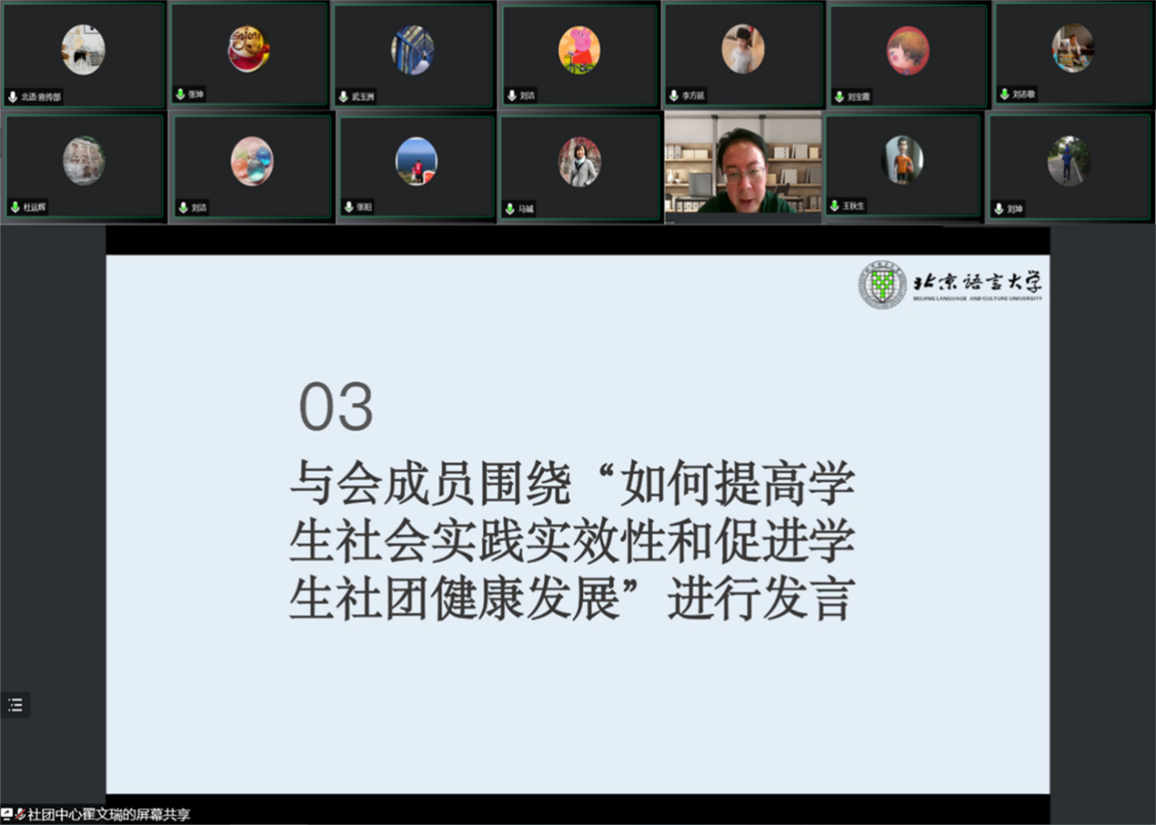 与会的领导老师围绕“如何提高学生社会实践实效性和促进学生社团健康发展”进行发言,各位老师结合自身工作经验为共同做好社会实践和学生社团工作提出了建设性意见。宣传部黄展老师对近三年的社会实践和学生社团工作进行了总结,希望今后的社会实践和社团工作能够开拓新思路,尝试新途径。学工部武玉洲老师提出要将学生的社会实践与所学专业以及职业生涯规划相结合。研工部刘洁老师建议可以把社会实践和硕士研究生的专业实践相结合,建立人才培养新模式。科研处刘志敬老师建议要加强与公司和机构的合作,使学生在社会实践中提升专业能力。国际合作与交流处蔺劼老师建议针对学生社团管理和作用发挥等方面,制定相应工作目标和评估考核标准。教师工作部张坤老师提出要将教师思政与学生思政相结合,鼓励青年教师加入到社会实践中来。人事处李方延老师充分肯定了社会实践和学生社团的育人作用,并就教师激励机制的完善提出了建设性意见。国际关系学院王秋生老师认为把社团管理下放到二级指导单位是一个很好的尝试,能够发挥学院的特色优势和主观能动性。外国语学部刘洁老师提出应该吸引更多的专业教师参与到社会实践中来,做出更多具有北语特色的优秀品牌。文学院张阳老师建议加强整体规划和设计,把社会实践与教学实践、职业生涯规划和学科评估等结合起来。新闻传播学院杨天乔老师建议要加强全校性的统筹规划,结合学校专业特色引导学生的社会实践,形成“社会实践促学习,学习成果帮实践”的良好导向。教务处刘宝霞老师提出要进一步发挥学生社团在学科竞赛中的作用,达到以赛促学的目的。马克思主义学院杜运辉老师指出要提升学术性,加强社会实践的学术含量。教师教育学院马铖老师提出应加强社团与各级团委和院系的合作,提升管理效率。体育教学部刘坤老师提出应进一步发挥学生社团的作用,促进学生德智体美劳全面发展。