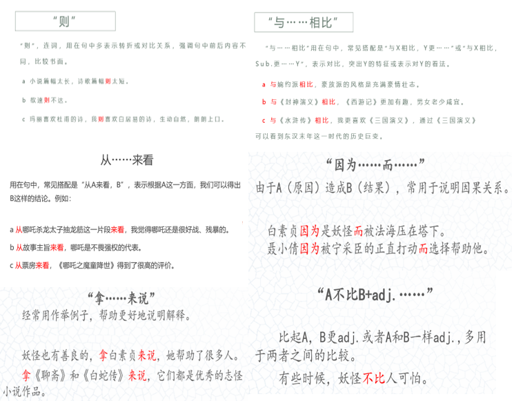 在语言点讲解部分,选择了适合学生汉语水平且在日常交际用语中常见和实用的语法点。包括:连词“则”“与……相比”“从……来看”“A不比B+adj.……”“因为……而……”以及“拿……来说”等的意义和用法。教师讲解得很认真,特别是在例句选取上,充分结合所学的文学知识进行精心设计,学生们在课上也及时和老师进行互动,积极参与课堂讨论。