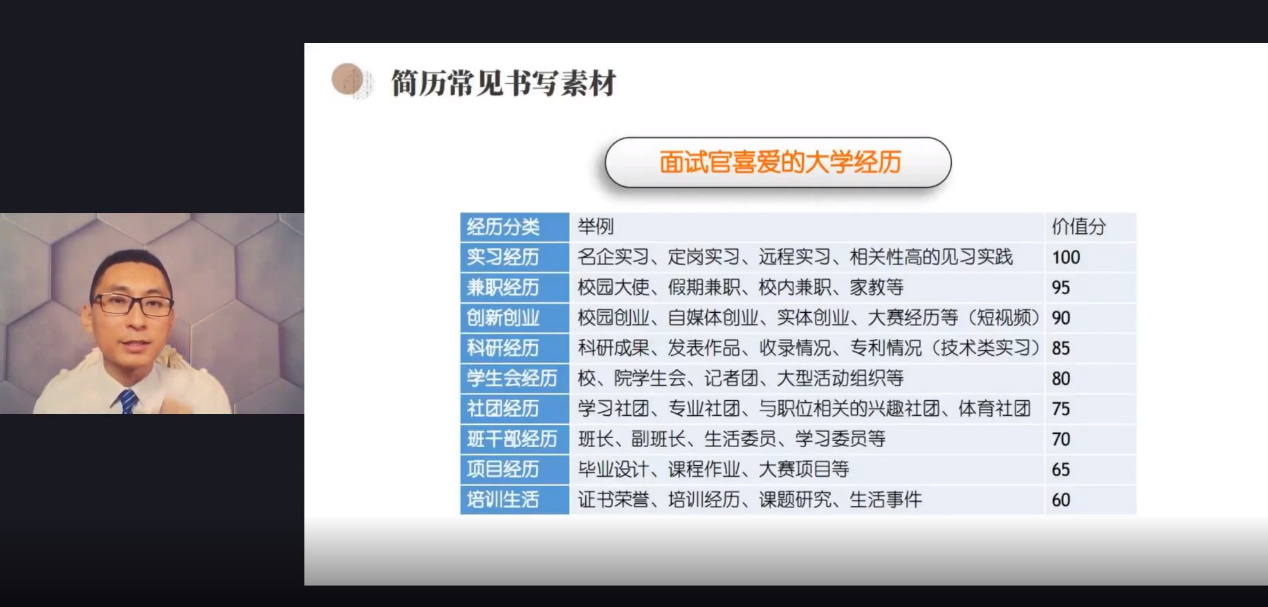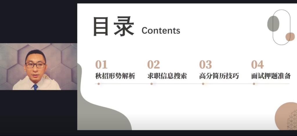 本次讲座主要从四个角度切入,主要分析介绍了当前的就业形势以及准备秋招的技巧与策略。张彤岩老师根据讲座前同学们填写的调查问卷,以及直播时同学们的互动反馈,不断调整讲座的侧重点,为处于不同学业阶段的学生提供了相应的指导建议和秋招策略。