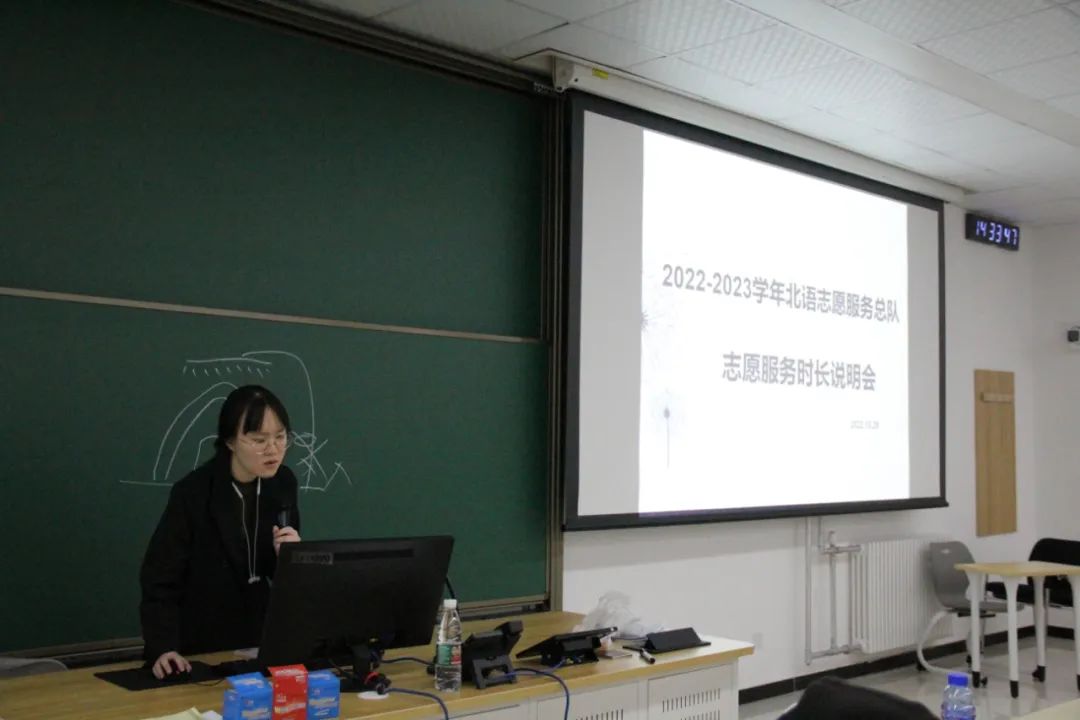10月28日14点30分,2022-2023学年北语志愿服务总队志愿服务时长说明会于教二131教室顺利开展。志愿者权益管理中心主任韩云舒担任主讲人,21、22级班长和团支书共计181人到场参加。