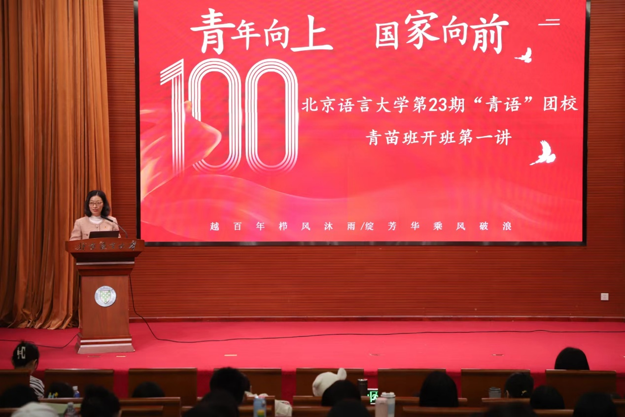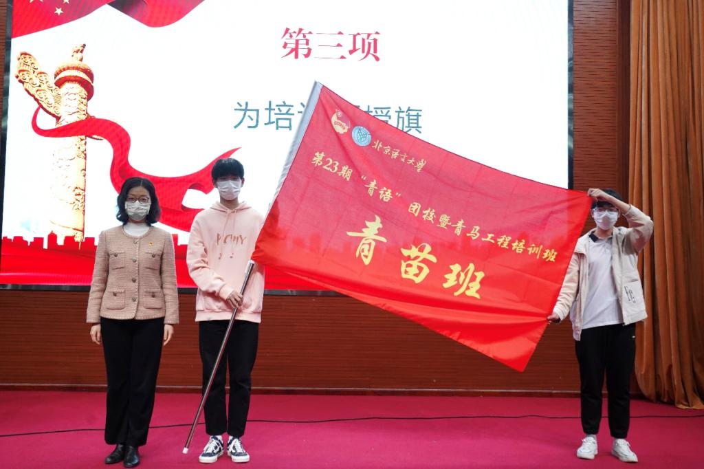 校团委书记张晴老师为青马工程培训班青苗班授旗,并作开班第一讲《青年向上,国家向前》。