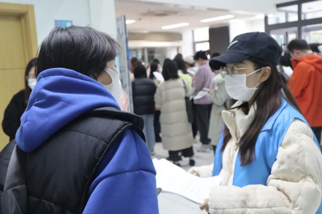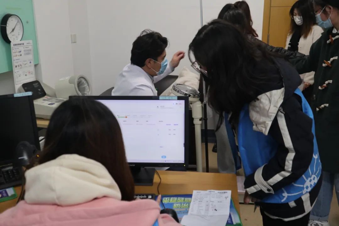 检查视力时,志愿者对照视力表为同学们测试视力,由医生测试色弱。三楼志愿者帮助新生测量血压并录入数据。随后同学们自行前往四楼测量身高体重。体检过程中,志愿者耐心解答同学们提出的问题,并做好相关记录,根据健康信息表向医生提供该学生的健康情况,帮助医生及时登记录入。