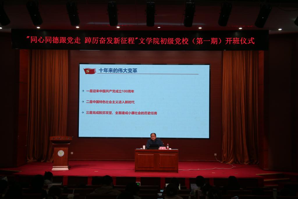 感悟思想伟力,凝聚奋进力量。11月7日,文学院“同心同德跟党走 踔厉奋发新征程”初级党校开班仪式于逸夫报告厅举行。文学院党委书记张阳以“新飞跃,新征程——学习党的二十大精神”为题做主题报告。70名学员和文学院全体学生党员参加讲座,讲座由本科生辅导员万阳卓主持。
