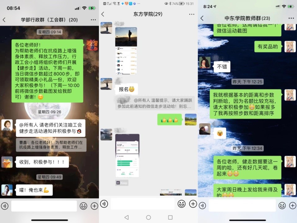 各个工会小组采用健步走、健身操、运动app打卡等多种方式进行线上运动打卡。外国语学部老师们积极响应、热情参与,最终七个工会小组还各自评出了本期“运动健将”名单。