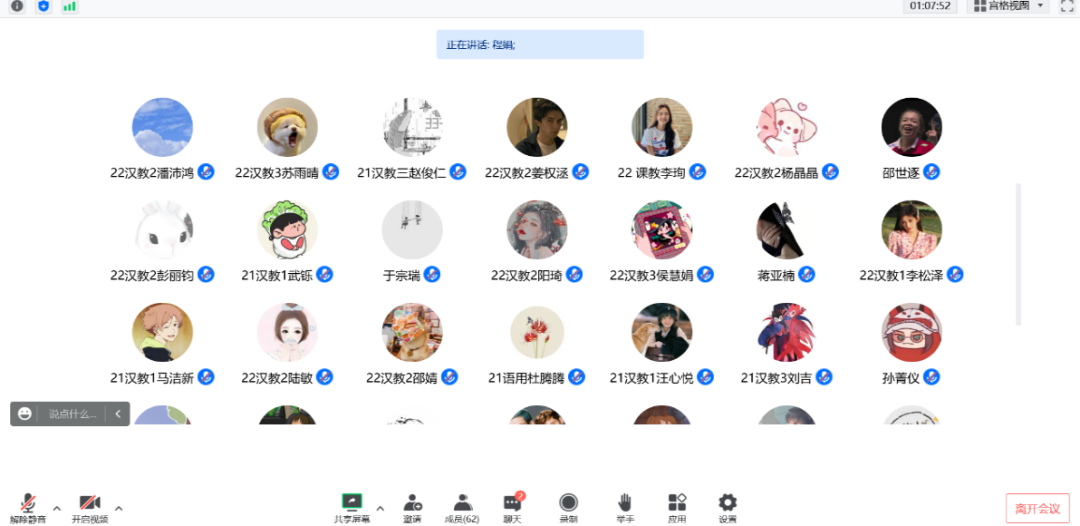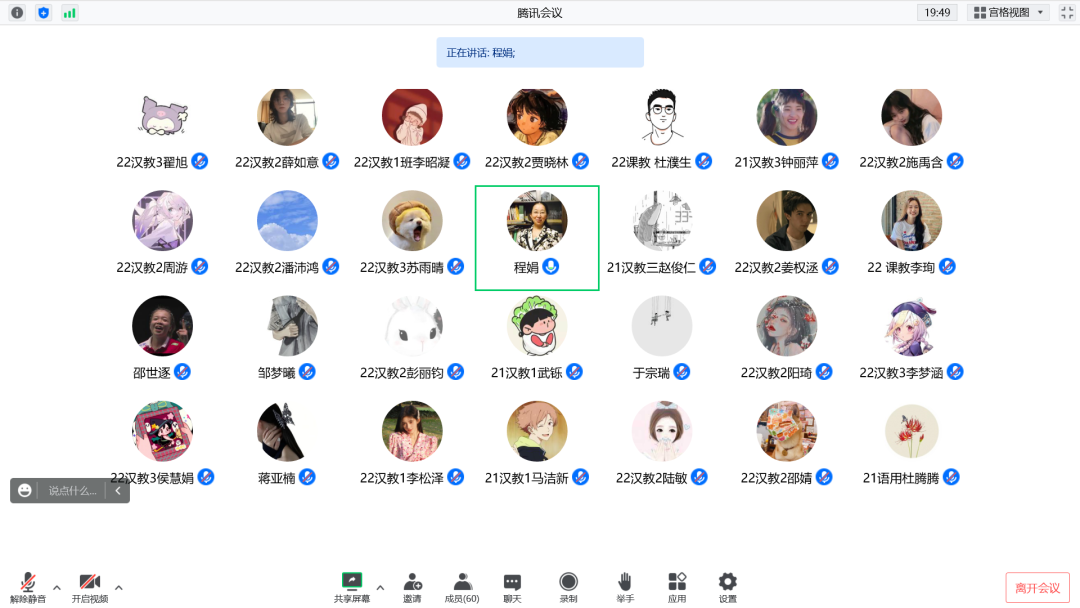 程娟书记表示,党的二十大召开于党于国具有特别的里程碑意义,应充分认识、思想重视,并在行动中有力落实。她从二十大召开的意义、二十大内容梳理以及二十大精神与学校、学院、专业更好结合三方面展开,着重强调了教育、科技、人才“三位一体”的亮点变化,指出其战略意义与深远影响。并以汉语国际教育学科为例,结合学校学院实际,分析把握具体方向、完善教育评价体系、厘清学科建设意义、培养创新人才、加快数字化建设、创新文化培养模式等方面对于落实立德树人根本任务的重要作用,启发同学们在日常学习工作中坚持问题导向、注重团队合作,将理论学习与专业实践紧密结合,在时代的潮流中把握机遇,奋勇拼搏。学员们态度认真,在课程学习中收益颇丰。