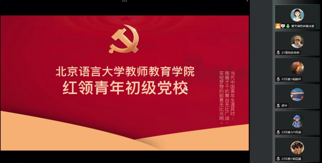 为深入学习贯彻党的二十大精神,引导广大师生认真领悟新思想、新论断、新部署、新要求,进一步以高质量党建引领高质量发展,培育融会贯通、真信笃行的高质量人才,中共北京语言大学教师教育学院委员会将于11月-12月举办第一期“红领青年”初级党校。11月29日中午,党校开班仪式暨第一讲于线上举行。教师教育学院党委书记程娟作主题报告,60余名学员参会学习,讲座由学院本科生辅导员曹文潇主持。