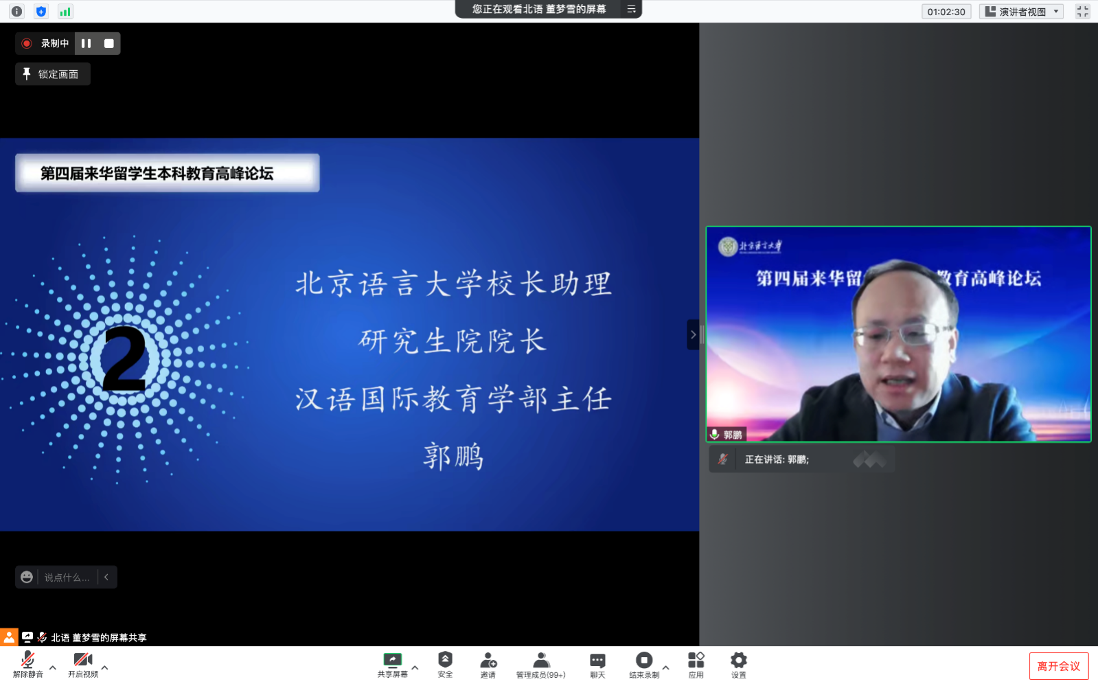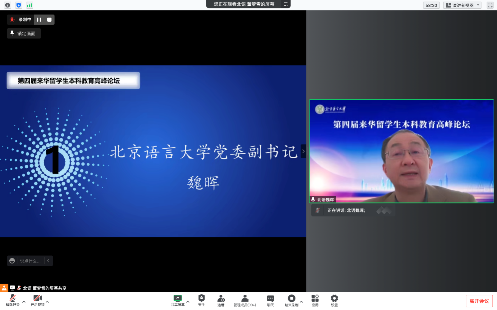 12月10日,第四届来华留学生本科教育高峰论坛在线上顺利召开。本次论坛由我校汉语国际教育学部汉语学院主办,采取主旨报告和分组研讨相结合的形式开展。北京语言大学魏晖副书记,校长助理、研究生院院长、汉语国际教育学部主任郭鹏教授出席论坛并发表了讲话。汉语学院院长张浩教授担任主持人。来自全国31所高校的近200名专家、教师、同学们相聚“云端”,在线参加了本次高峰论坛。