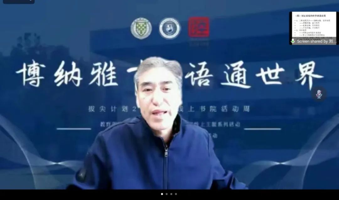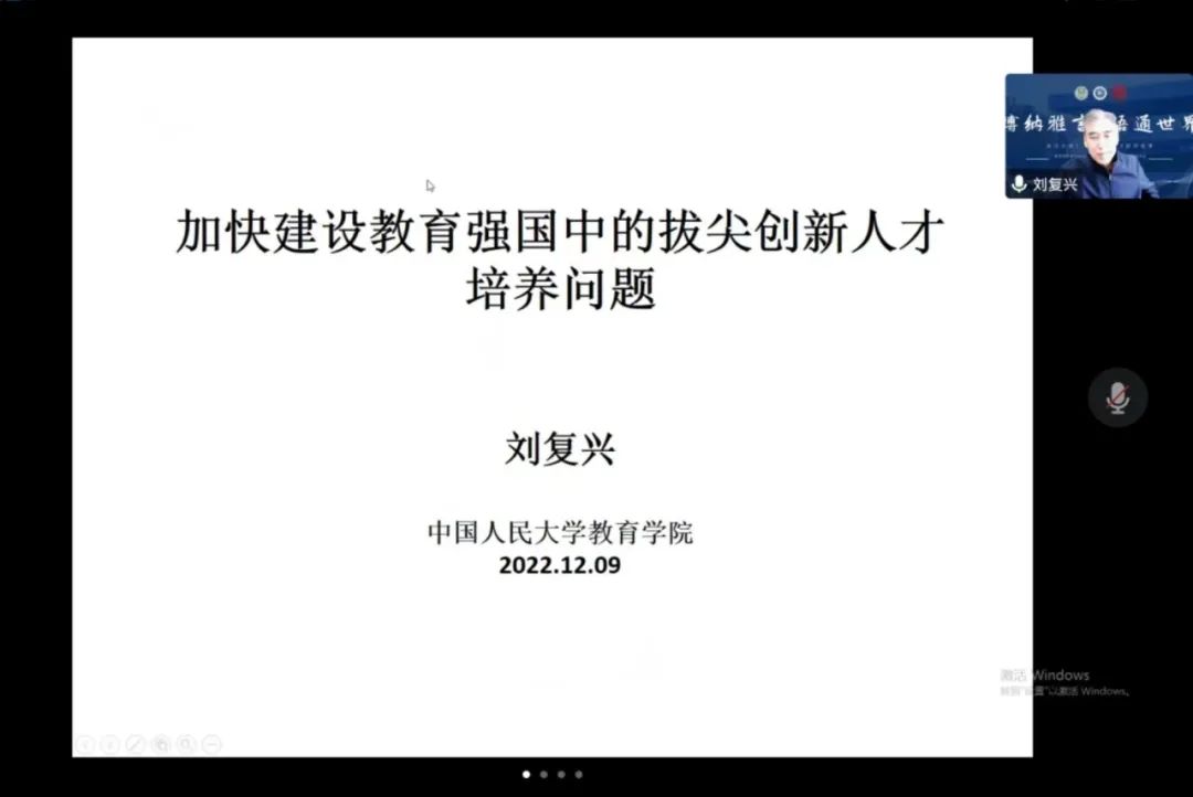 12月9日下午,由北京语言大学“中文国际传播”中国语言文学拔尖学生培养基地(国家基础学科拔尖学生培养计划2.0基地)主办的“博纳雅言,语通世界”拔尖计划2.0全国线上书院主题活动周“名师讲坛”第五讲“加快建设教育强国中的拔尖创新人才培养问题”顺利开讲。本次报告由中国人民大学刘复兴教授主讲,北京语言大学教师教育学院郭睿教授主持。